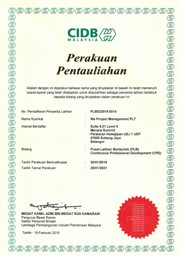 We Project Management PLT as a CERTIFIED TRAINING PROVIDER (PUSAT LATIHAN BERTAULIAH) for CONSTRUCTION INDUSTRY DEVELOPMENT BOARD (CIDB) provides relevant trainings on Construction Project Management related topics as below: