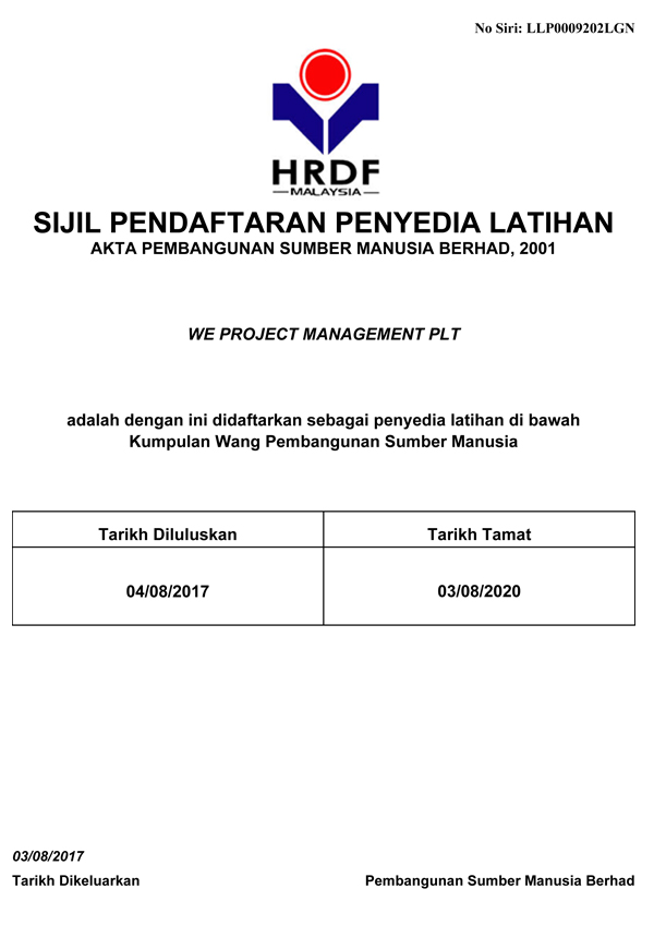 Besides, We Project Management PLT as a Certified Training Providers under Human Resource Development Fund constantly provides value added project management relevant training courses for industry players.